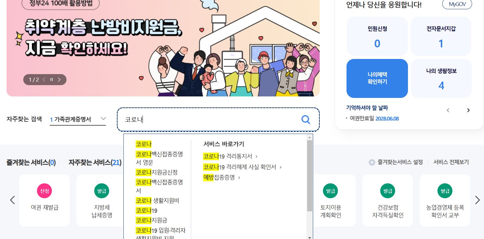 검색창에 '코로나' 또는 '코로나 지원금'을 검색한다.